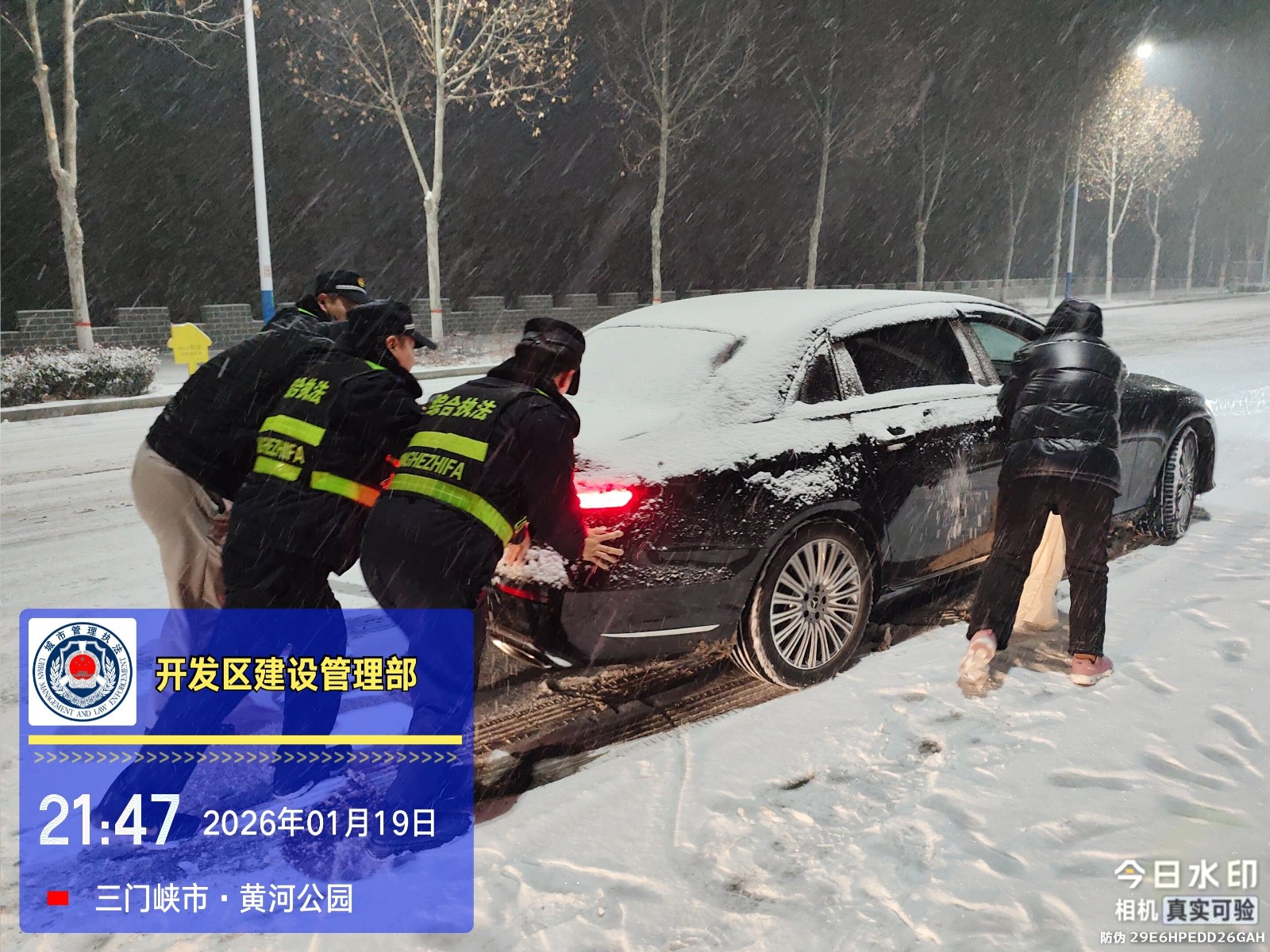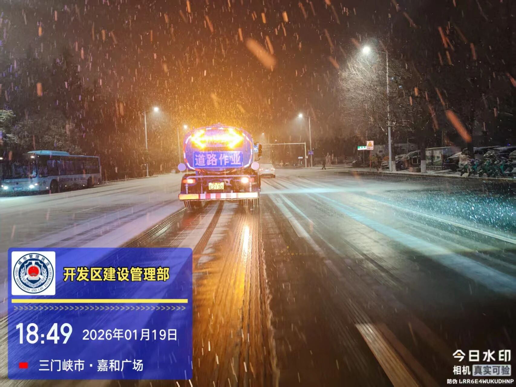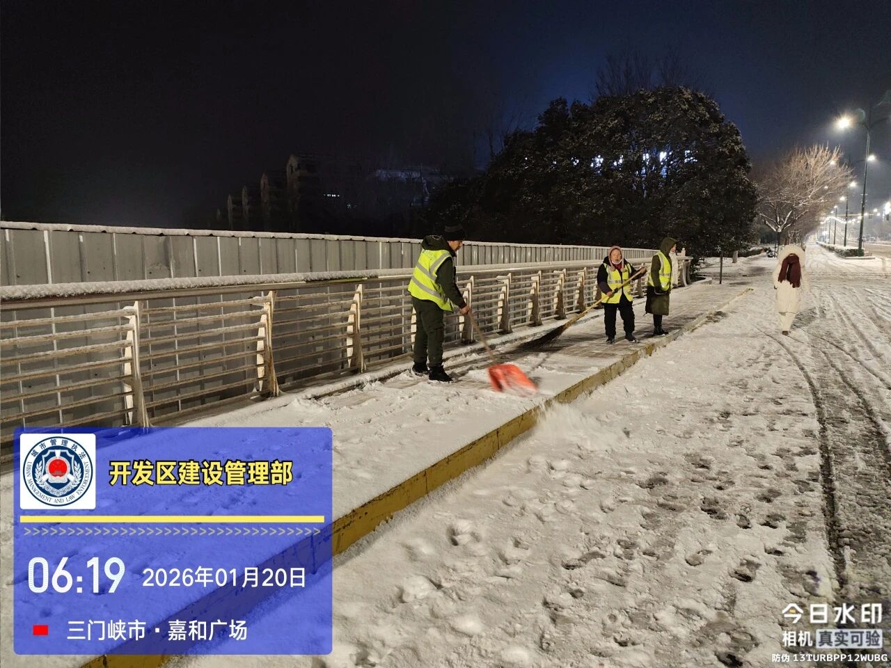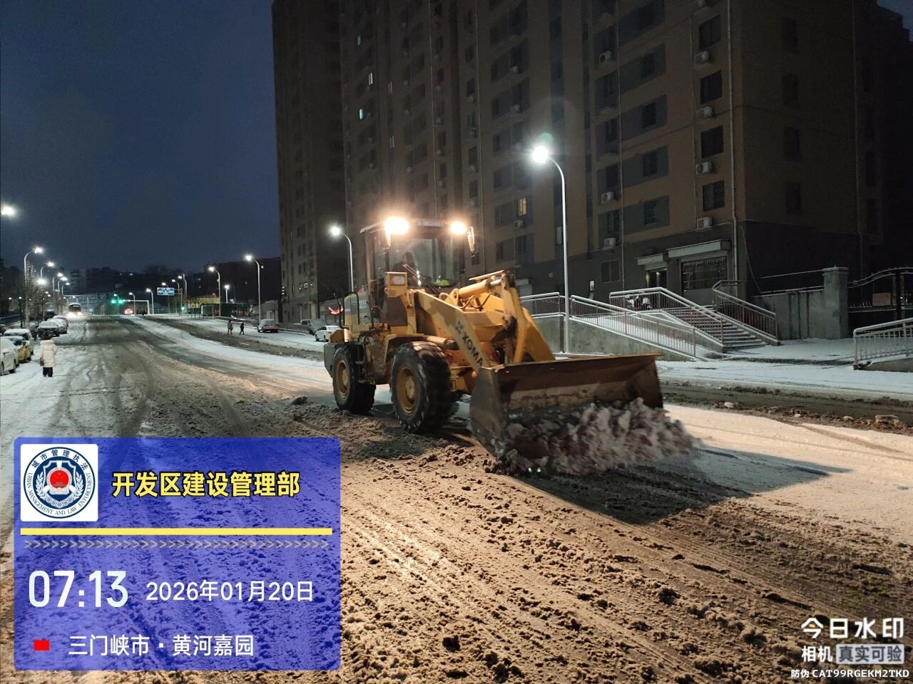由于夜间气温降低,部分路段出现反复结冰现象。为保障早高峰出行安全,1月20日清晨五点,天色未明,建设管理部再次组织人员奔赴各路段,开展新一轮清雪和隐患排查工作。工作人员不畏严寒、分工协作,对残留积雪和结冰路段进行集中清理,同步检查道路状况、补充融雪物资,切实守护城市道路“动脉”,确保安全畅通。